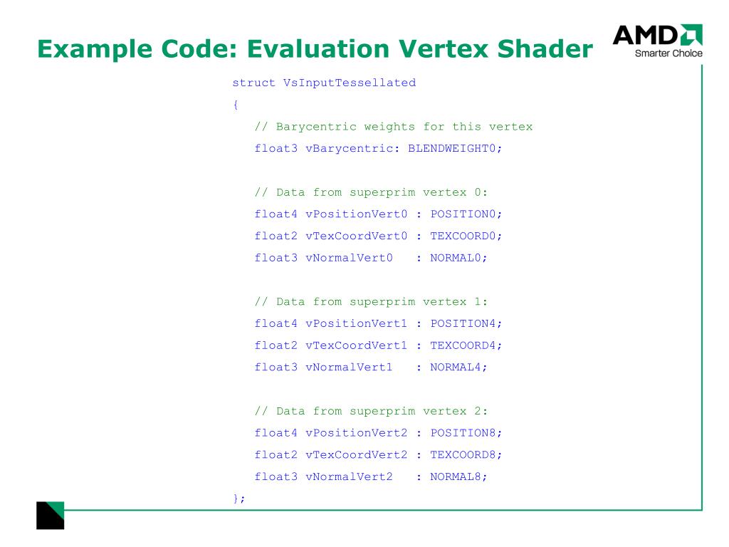 Example Code: Evaluation Vertex Shader struct VsInputTessellated { // Barycentric weights for this vertex float3 vBarycentric: BLENDWEIGHT0; // Data from superprim vertex 0: float4 vPositionVert0 : POSITION0; float2 vTexCoordVert0 : TEXCOORD0; float3 vNormalVert0 : NORMAL0; // Data from superprim vertex 1: float4 vPositionVert1 : POSITION4; float2 vTexCoordVert1 : TEXCOORD4; float3 vNormalVert1 : NORMAL4; // Data from superprim vertex 2: float4 vPositionVert2 : POSITION8; float2 vTexCoordVert2 : TEXCOORD8; float3 vNormalVert2 : NORMAL8; };