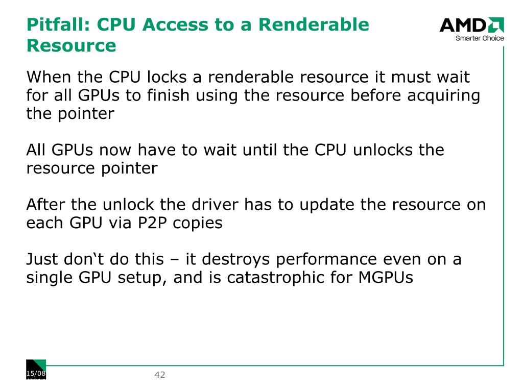 Pitfall: CPU Access to a Renderable Resource • When the CPU locks a renderable resource it must wait for all GPUs to finish using the resource before acquiring the pointer • All GPUs now have to wait until the CPU unlocks the resource pointer • After the unlock the driver has to update the resource on each GPU via P2P copies • Just don‘t do this – it destroys performance even on a single GPU setup, and is catastrophic for MGPUs