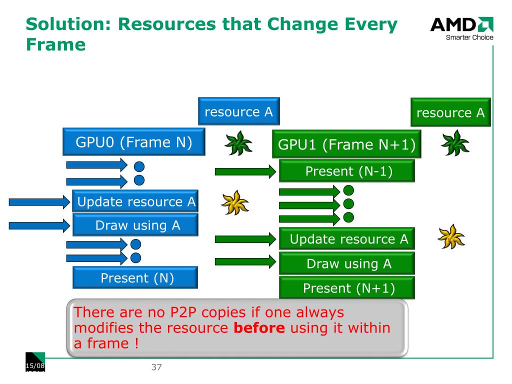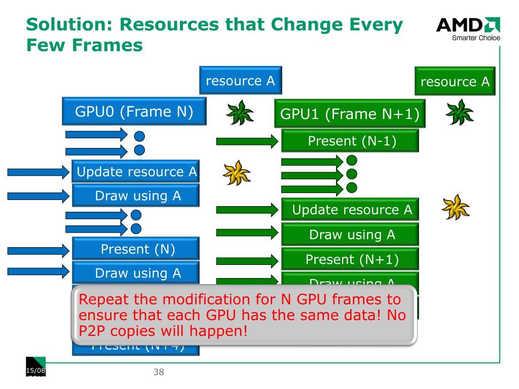 Solution: Resources that Change Every Frame resource A resource A GPU0 (Frame N) GPU1 (Frame N+1) Present (N-1) Update resource A Draw using A Update resource A Draw using A Present (N) Present (N+1)