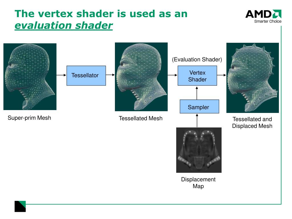 (Evaluation Shader) Vertex Shader Tessellator Super-prim Mesh Tessellated Mesh Tessellated and Displaced Mesh Sampler Displacement Map The vertex shader is used as an evaluation shader