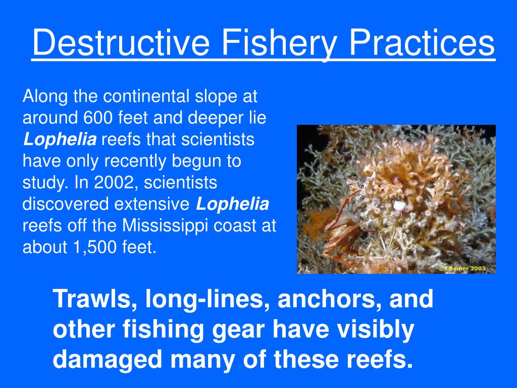 Destructive Fishery Practices Along the continental slope at around 600 feet and deeper lie Lopheliareefs that scientists have only recently begun to study. In 2002, scientists discovered extensive Lopheliareefs off the Mississippi coast at about 1,500 feet. Trawls, long-lines, anchors, and other fishing gear have visibly damaged many of these reefs.