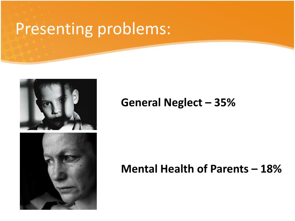 Presenting problems: Mental Health of Parents – 18% General Neglect – 35%