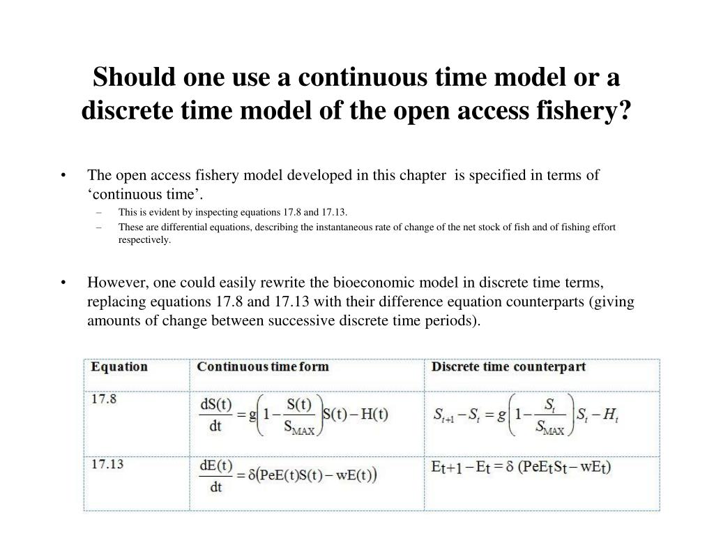 Should one use a continuous time model or a discrete time model of the open access fishery? • The open access fishery model developed in this chapter is specified in terms of ‘continuous time’. • This is evident by inspecting equations 17.8 and 17.13. • These are differential equations, describing the instantaneous rate of change of the net stock of fish and of fishing effort respectively. • However, one could easily rewrite the bioeconomic model in discrete time terms, replacing equations 17.8 and 17.13 with their difference equation counterparts (giving amounts of change between successive discrete time periods).