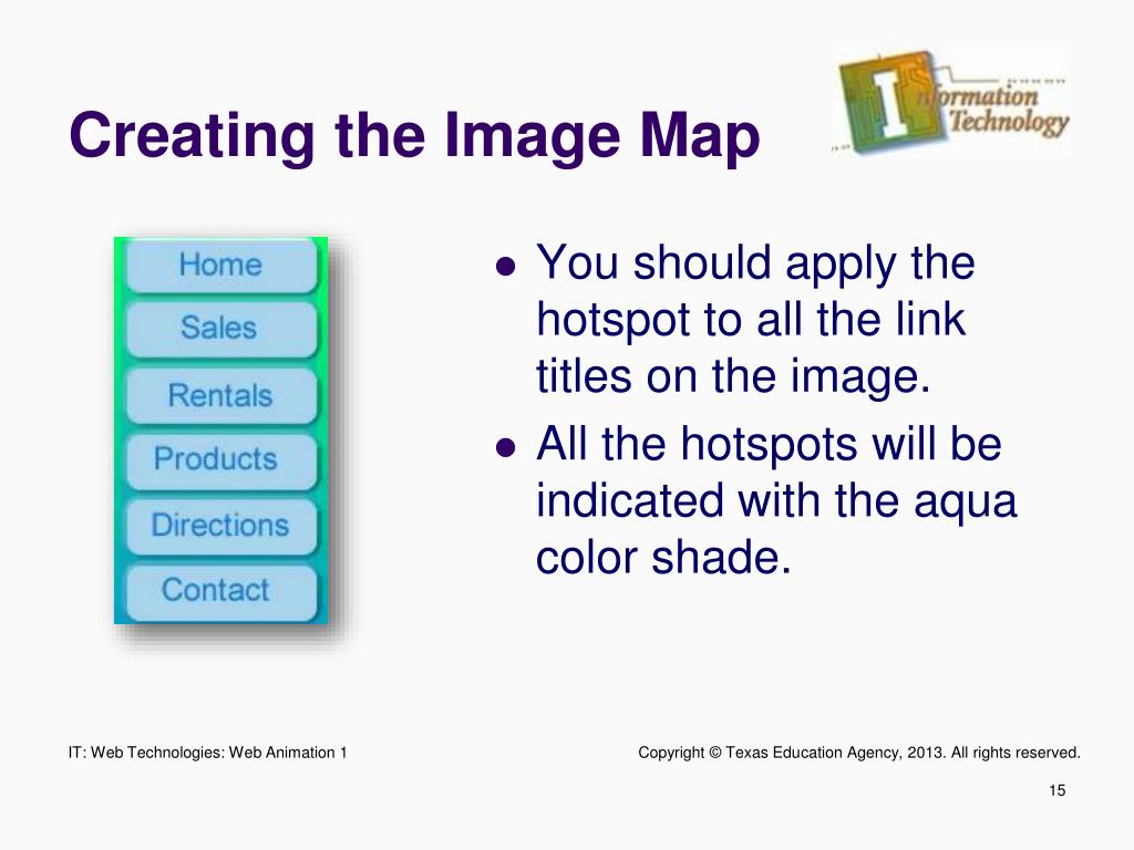 Creating the Image Map • You should apply the hotspot to all the link titles on the image. • All the hotspots will be indicated with the aqua color shade.