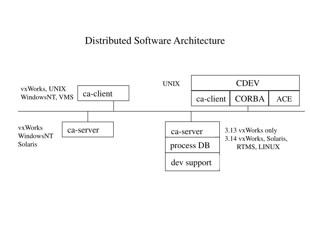 Distributed Software Architecture CDEV UNIX vxWorks, UNIX WindowsNT, VMS ca-client ca-client CORBA ACE vxWorks WindowsNT Solaris ca-server 3.13 vxWorks only 3.14 vxWorks, Solaris, RTMS, LINUX ca-server process DB dev support