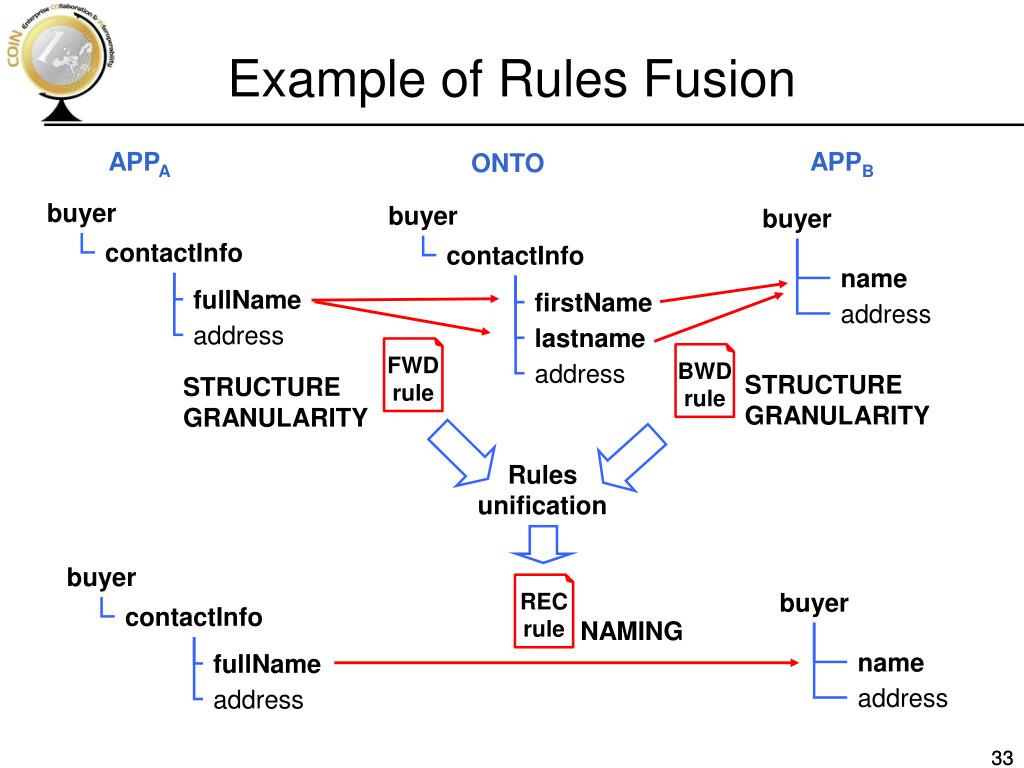 Transformation Rules Fusion • Objective: to fuse sender’s forward and receiver’s backward rules in order to improve actual doc exchange • More straight forward reconciliation • Avoid useless transformations • Semantic preserving fusion • Finite set of transformation patterns • Resulting rules • still semantic rules (i.e., the ontology is still behind) • but no actual generation of intermediate document representation (ontology-based) 32