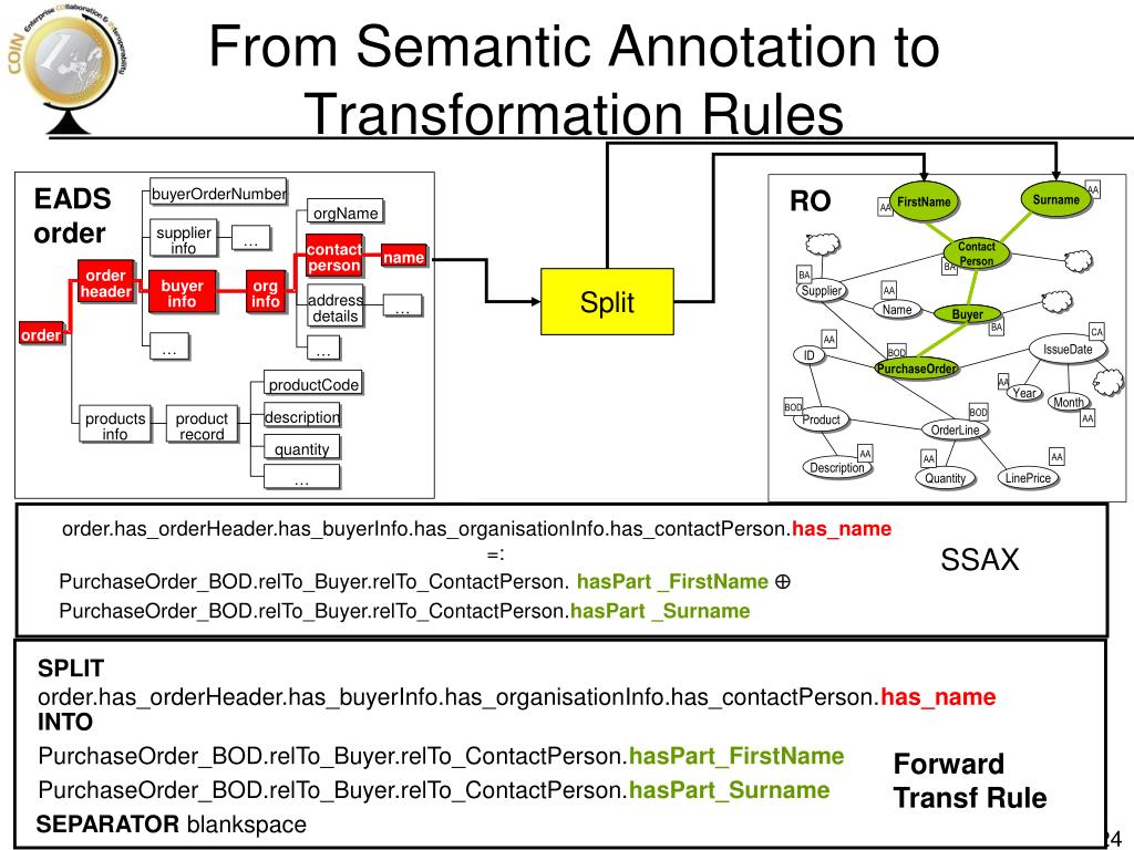 Split AA buyerOrderNumber buyerOrderNumber Surname Surname Surname FirstName Surname FirstName FirstName Surname Surname FirstName FirstName FirstName AA orgName orgName supplier supplier … … Contact Contact Contact info Contact Contact Contact contact contact info contact contact contact contact name name name name name Person name Person Person Person Person Person person person person person person BA person order order BA order order order order buyer buyer org org buyer org buyer buyer org org buyer org Supplier header header AA Supplier header header header header address info info info info address info info info info info info info info … Name … Name Buyer Buyer Buyer Buyer Buyer Buyer details details BA CA order order order order order order AA IssueDate … IssueDate … … … BOD ID ID PurchaseOrder PurchaseOrder PurchaseOrder PurchaseOrder PurchaseOrder PurchaseOrder AA productCode productCode Year Year Month Month BOD BOD description Product AA products product description Product products product OrderLine OrderLine info record info record quantity quantity AA AA AA Description Description LinePrice Quantity LinePrice Quantity … … From Semantic Annotation to Transformation Rules RO EADS order RO RO order.has_orderHeader.has_buyerInfo.has_organisationInfo.has_contactPerson.has_name SSAX =: PurchaseOrder_BOD.relTo_Buyer.relTo_ContactPerson. hasPart _FirstNameÅ PurchaseOrder_BOD.relTo_Buyer.relTo_ContactPerson.hasPart _Surname SPLIT order.has_orderHeader.has_buyerInfo.has_organisationInfo.has_contactPerson.has_name INTO PurchaseOrder_BOD.relTo_Buyer.relTo_ContactPerson.hasPart_FirstName PurchaseOrder_BOD.relTo_Buyer.relTo_ContactPerson.hasPart_Surname Forward Transf Rule SEPARATOR blankspace