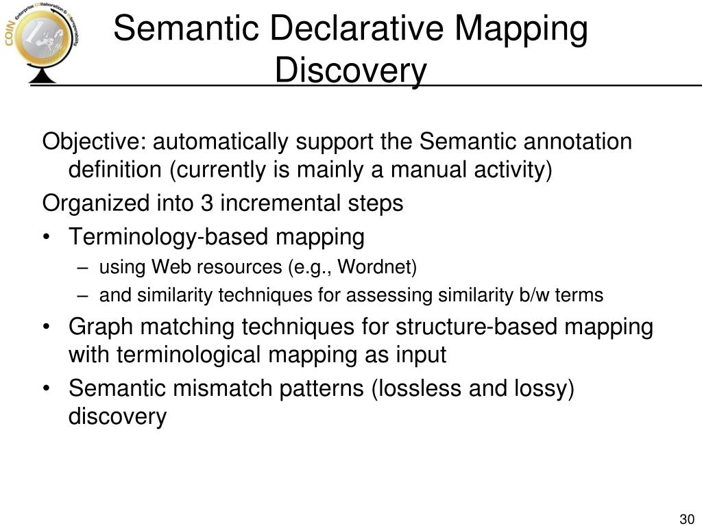 Semantic Declarative Mapping Discovery Objective: automatically support the Semantic annotation definition (currently is mainly a manual activity) Organized into 3 incremental steps • Terminology-based mapping • using Web resources (e.g., Wordnet) • and similarity techniques for assessing similarity b/w terms • Graph matching techniques for structure-based mapping with terminological mapping as input • Semantic mismatch patterns (lossless and lossy) discovery