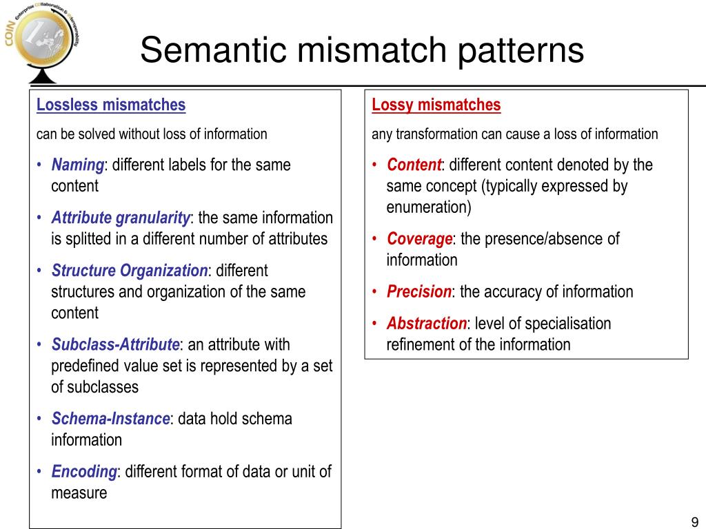 Semantic mismatch patterns • Lossless mismatches • can be solved without loss of information • Naming: different labels for the same content • Attribute granularity: the same information is splitted in a different number of attributes • Structure Organization: different structures and organization of the same content • Subclass-Attribute: an attribute with predefined value set is represented by a set of subclasses • Schema-Instance:data hold schema information • Encoding: different format of data or unit of measure • Lossy mismatches • any transformation can cause a loss of information • Content: different content denoted by the same concept (typically expressed by enumeration) • Coverage: the presence/absence of information • Precision: the accuracy of information • Abstraction: level of specialisation refinement of the information