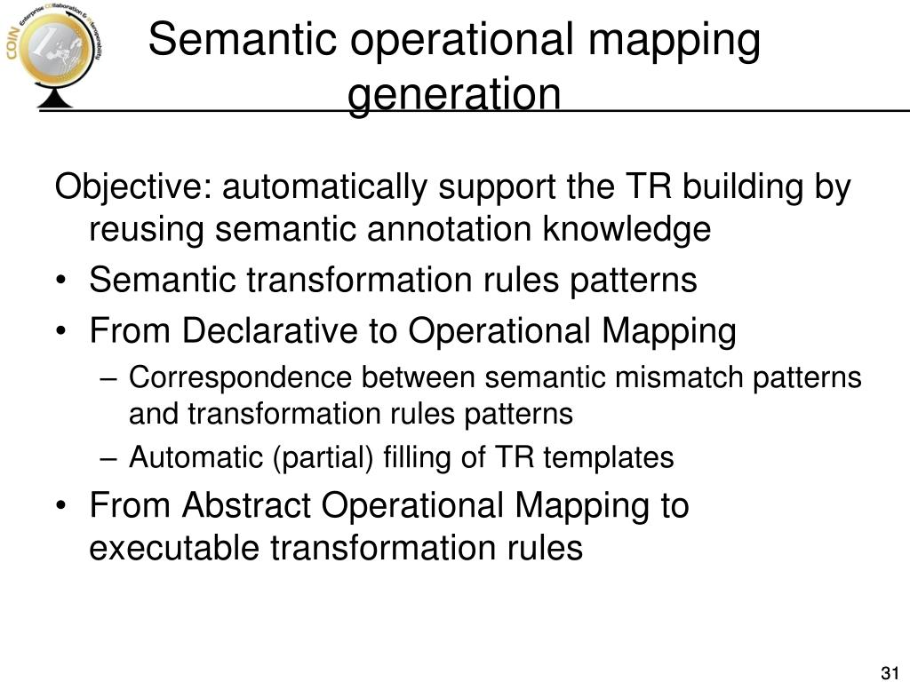 Semantic operational mapping generation Objective: automatically support the TR building by reusing semantic annotation knowledge • Semantic transformation rules patterns • From Declarative to Operational Mapping • Correspondence between semantic mismatch patterns and transformation rules patterns • Automatic (partial) filling of TR templates • From Abstract Operational Mapping to executable transformation rules 31
