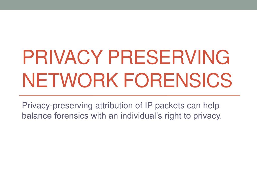 Privacy preserving network forensics. Privacy-preserving attribution of IP packets can help balance forensics with an individual’s right to privacy. Overview . Research in network security has traditionally focused on defense mechanisms designed to impede an adversary.