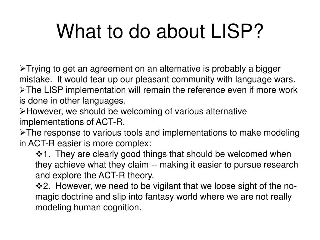 What to do about LISP? • Trying to get an agreement on an alternative is probably a bigger mistake. It would tear up our pleasant community with language wars. • The LISP implementation will remain the reference even if more work is done in other languages. • However, we should be welcoming of various alternative implementations of ACT-R. • The response to various tools and implementations to make modeling in ACT-R easier is more complex: • 1. They are clearly good things that should be welcomed when they achieve what they claim -- making it easier to pursue research and explore the ACT-R theory. • 2. However, we need to be vigilant that we loose sight of the no-magic doctrine and slip into fantasy world where we are not really modeling human cognition.