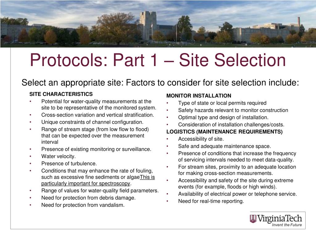 Protocols: Part 1 – Site Selection Select an appropriate site: Factors to consider for site selection include: SITE CHARACTERISTICS • Potential for water-quality measurements at the site to be representative of the monitored system. • Cross-section variation and vertical stratification. • Unique constraints of channel configuration. • Range of stream stage (from low flow to flood) that can be expected over the measurement interval • Presence of existing monitoring or surveillance. • Water velocity. • Presence of turbulence. • Conditions that may enhance the rate of fouling, such as excessive fine sediments or algaeThis is particularly important for spectroscopy. • Range of values for water-quality field parameters. • Need for protection from debris damage. • Need for protection from vandalism. MONITOR INSTALLATION • Type of state or local permits required • Safety hazards relevant to monitor construction • Optimal type and design of installation. • Consideration of installation challenges/costs. LOGISTICS (MAINTENANCE REQUIREMENTS) • Accessibility of site. • Safe and adequate maintenance space. • Presence of conditions that increase the frequency of servicing intervals needed to meet data-quality. • For stream sites, proximity to an adequate location for making cross-section measurements. • Accessibility and safety of the site during extreme events (for example, floods or high winds). • Availability of electrical power or telephone service. • Need for real-time reporting.