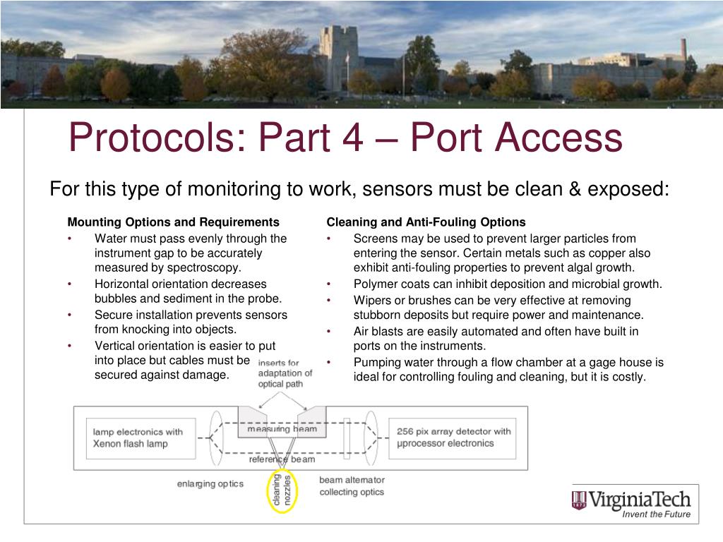 Protocols: Part 4 – Port Access For this type of monitoring to work, sensors must be clean & exposed: Mounting Options and Requirements • Water must pass evenly through the instrument gap to be accurately measured by spectroscopy. • Horizontal orientation decreases bubbles and sediment in the probe. • Secure installation prevents sensors from knocking into objects. • Vertical orientation is easier to put into place but cables must besecured against damage. Cleaning and Anti-Fouling Options • Screens may be used to prevent larger particles from entering the sensor. Certain metals such as copper also exhibit anti-fouling properties to prevent algal growth. • Polymer coats can inhibit deposition and microbial growth. • Wipers or brushes can be very effective at removing stubborn deposits but require power and maintenance. • Air blasts are easily automated and often have built in ports on the instruments. • Pumping water through a flow chamber at a gage house is ideal for controlling fouling and cleaning, but it is costly.