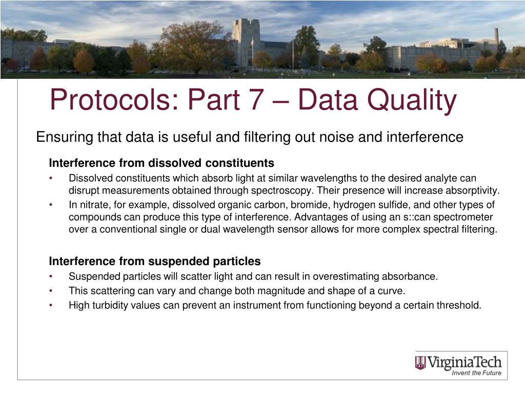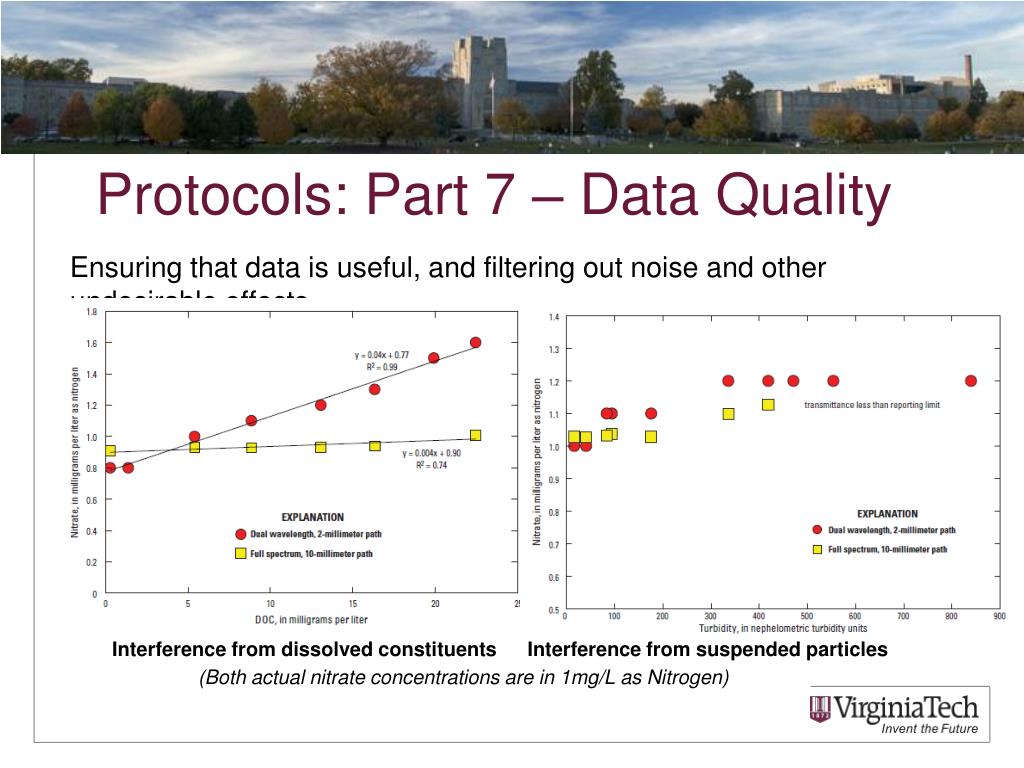 Protocols: Part 7 – Data Quality Ensuring that data is useful, and filtering out noise and other undesirable effects Interference from dissolved constituents Interference from suspended particles (Both actual nitrate concentrations are in 1mg/L as Nitrogen)