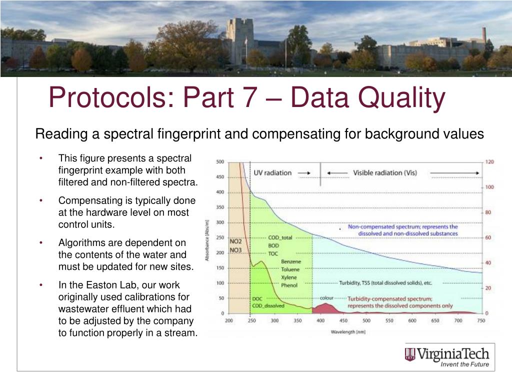 Protocols: Part 7 – Data Quality Reading a spectral fingerprint and compensating for background values • This figure presents a spectral fingerprint example with both filtered and non-filtered spectra. • Compensating is typically done at the hardware level on most control units. • Algorithms are dependent on the contents of the water and must be updated for new sites. • In the Easton Lab, our work originally used calibrations for wastewater effluent which had to be adjusted by the company to function properly in a stream.