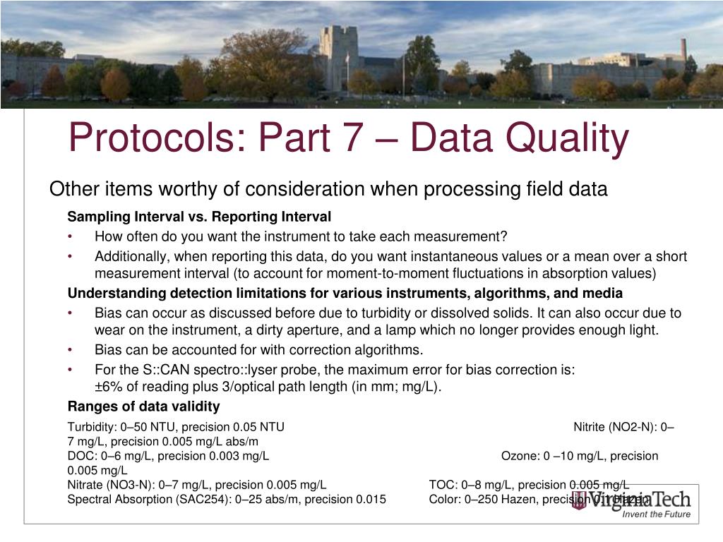 Protocols: Part 7 – Data Quality Other items worthy of consideration when processing field data Sampling Interval vs. Reporting Interval • How often do you want the instrument to take each measurement? • Additionally, when reporting this data, do you want instantaneous values or a mean over a short measurement interval (to account for moment-to-moment fluctuations in absorption values) Understanding detection limitations for various instruments, algorithms, and media • Bias can occur as discussed before due to turbidity or dissolved solids. It can also occur due to wear on the instrument, a dirty aperture, and a lamp which no longer provides enough light. • Bias can be accounted for with correction algorithms. • For the S::CAN spectro::lyser probe, the maximum error for bias correction is: ±6% of reading plus 3/optical path length (in mm; mg/L). Ranges of data validity Turbidity: 0–50 NTU, precision 0.05 NTU Nitrite (NO2-N): 0–7 mg/L, precision 0.005 mg/L abs/m DOC: 0–6 mg/L, precision 0.003 mg/L Ozone: 0 –10 mg/L, precision 0.005 mg/L Nitrate (NO3-N): 0–7 mg/L, precision 0.005 mg/L TOC: 0–8 mg/L, precision 0.005 mg/L Spectral Absorption (SAC254): 0–25 abs/m, precision 0.015 Color: 0–250 Hazen, precision 0.1 Hazen