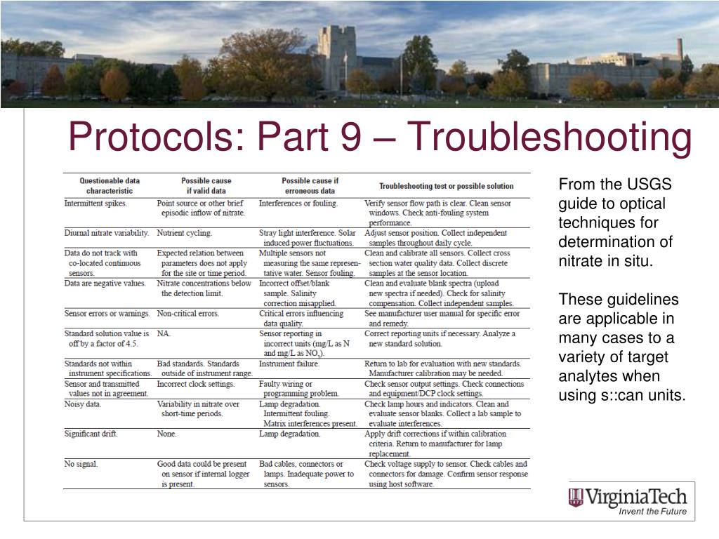 Protocols: Part 9 – Troubleshooting From the USGS guide to optical techniques for determination of nitrate in situ. These guidelines are applicable in many cases to a variety of target analytes when using s::can units.