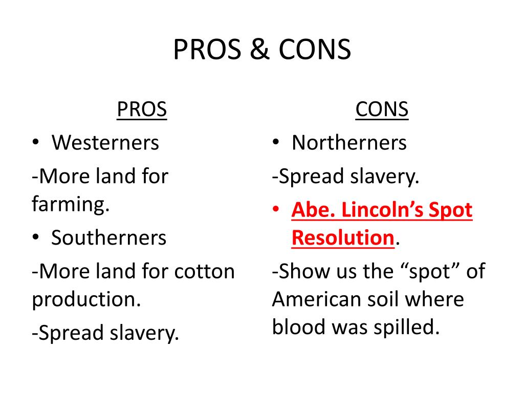 PROS & CONS PROS • Westerners -More land for farming. • Southerners -More land for cotton production. -Spread slavery. CONS • Northerners -Spread slavery. • Abe. Lincoln’s Spot Resolution. -Show us the “spot” of American soil where blood was spilled.