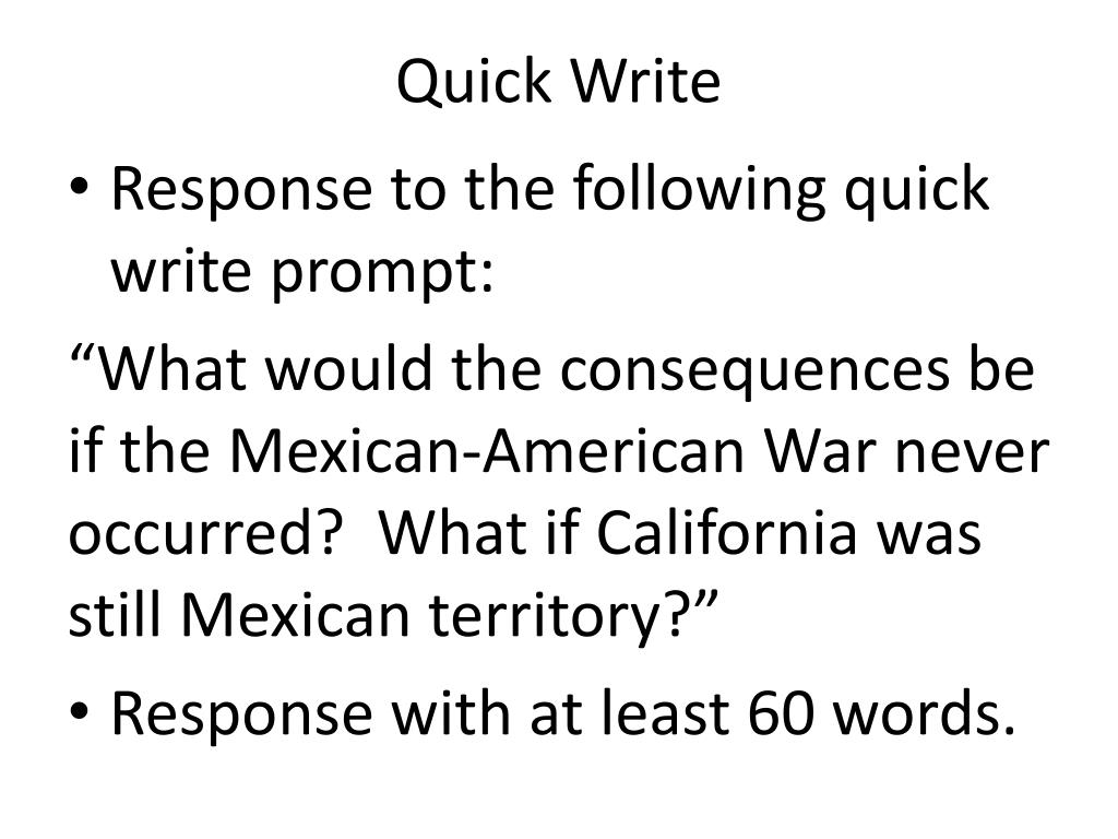 Quick Write • Response to the following quick write prompt: “What would the consequences be if the Mexican-American War never occurred? What if California was still Mexican territory?” • Response with at least 60 words.