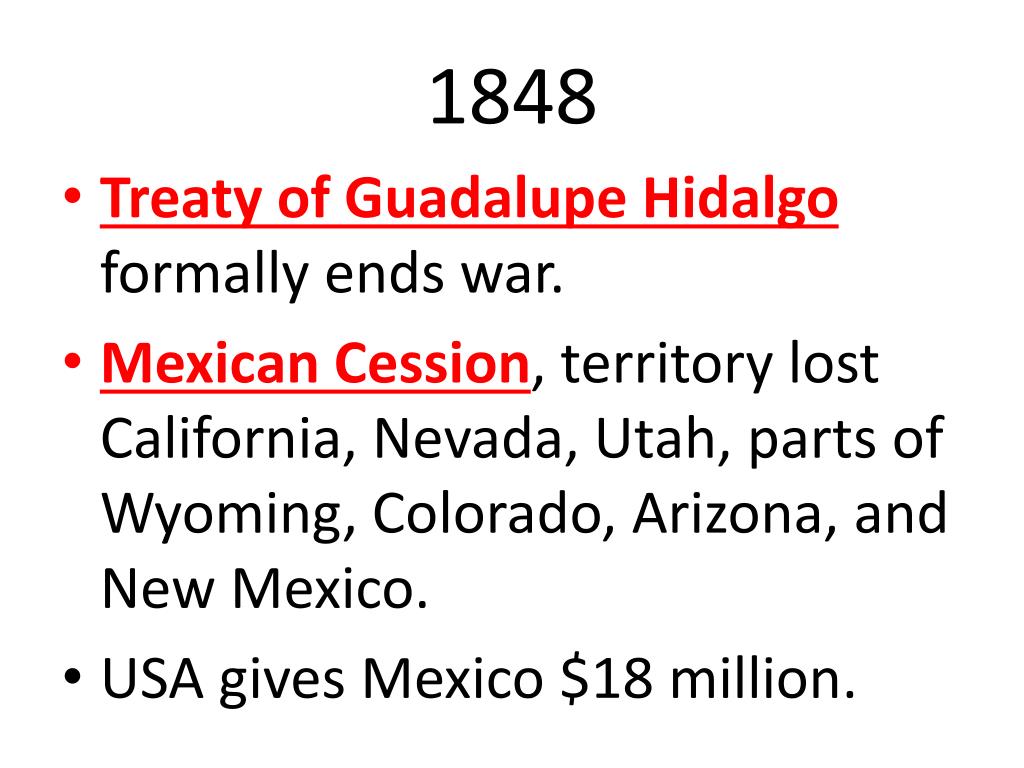 1848 • Treaty of Guadalupe Hidalgo formally ends war. • Mexican Cession, territory lost California, Nevada, Utah, parts of Wyoming, Colorado, Arizona, and New Mexico. • USA gives Mexico $18 million.