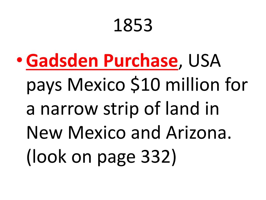 1853 • Gadsden Purchase, USA pays Mexico $10 million for a narrow strip of land in New Mexico and Arizona. (look on page 332)
