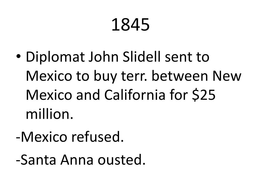 1845 • Diplomat John Slidell sent to Mexico to buy terr. between New Mexico and California for $25 million. -Mexico refused. -Santa Anna ousted.