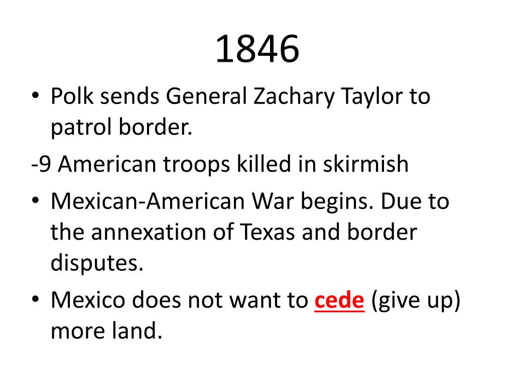 1846 • Polk sends General Zachary Taylor to patrol border. -9 American troops killed in skirmish • Mexican-American War begins. Due to the annexation of Texas and border disputes. • Mexico does not want to cede (give up) more land.
