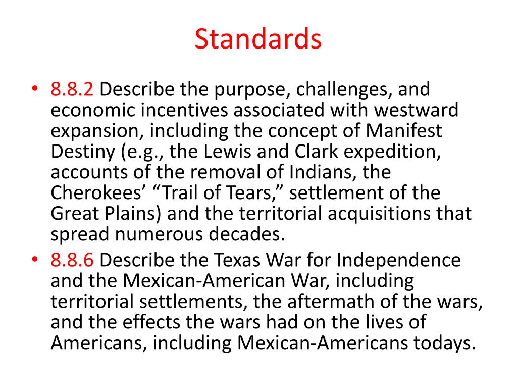 Standards • 8.8.2 Describe the purpose, challenges, and economic incentives associated with westward expansion, including the concept of Manifest Destiny (e.g., the Lewis and Clark expedition, accounts of the removal of Indians, the Cherokees’ “Trail of Tears,” settlement of the Great Plains) and the territorial acquisitions that spread numerous decades. • 8.8.6 Describe the Texas War for Independence and the Mexican-American War, including territorial settlements, the aftermath of the wars, and the effects the wars had on the lives of Americans, including Mexican-Americans todays.