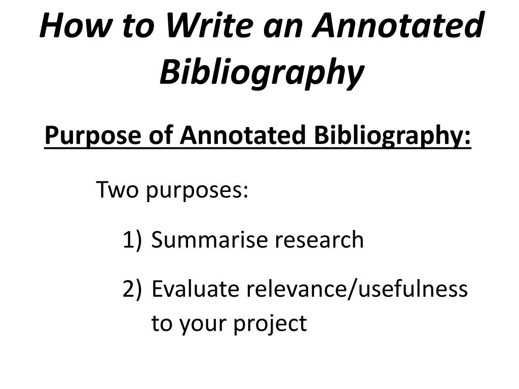 How to Write an Annotated Bibliography. Purpose of Annotated Bibliography: Two purposes: Summarise research Evaluate relevance/usefulness to your project. How to Write an Annotated Bibliography. Structure: