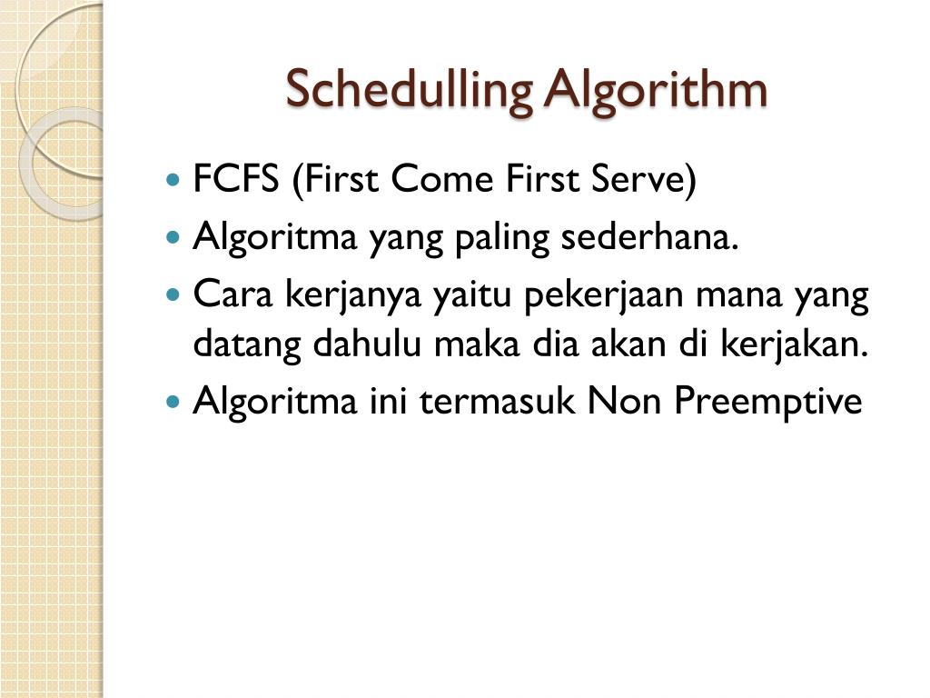 Schedulling Algorithm • FCFS (First Come First Serve) • Algoritma yang paling sederhana. • Cara kerjanyayaitupekerjaanmana yang datangdahulumakadiaakandikerjakan. • Algoritmainitermasuk Non Preemptive