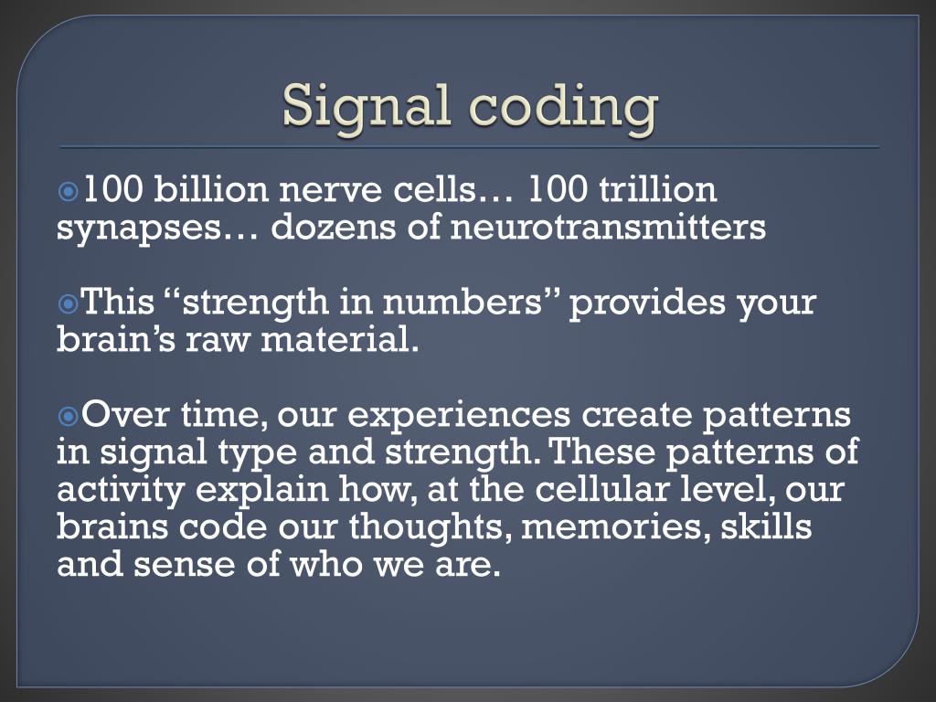 Signal coding 100 billion nerve cells… 100 trillion synapses… dozens of neurotransmitters This “strength in numbers” provides your brain’s raw material. Over time, our experiences create patterns in signal type and strength. These patterns of activity explain how, at the cellular level, our brains code our thoughts, memories, skills and sense of who we are.