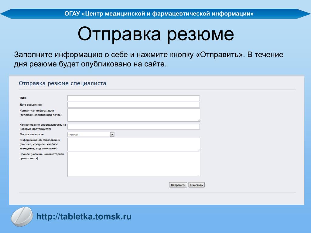 ОГАУ «Центр медицинской и фармацевтической информации» Отправка резюме Заполните информацию о себе и нажмите кнопку «Отправить». В течение дня резюме будет опубликовано на сайте. http://tabletka.tomsk.ru