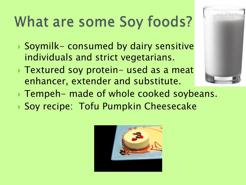 Soymilk- consumed by dairy sensitive individuals and strict vegetarians. • Textured soy protein- used as a meat enhancer, extender and substitute. • Tempeh- made of whole cooked soybeans. • Soy recipe: Tofu Pumpkin Cheesecake