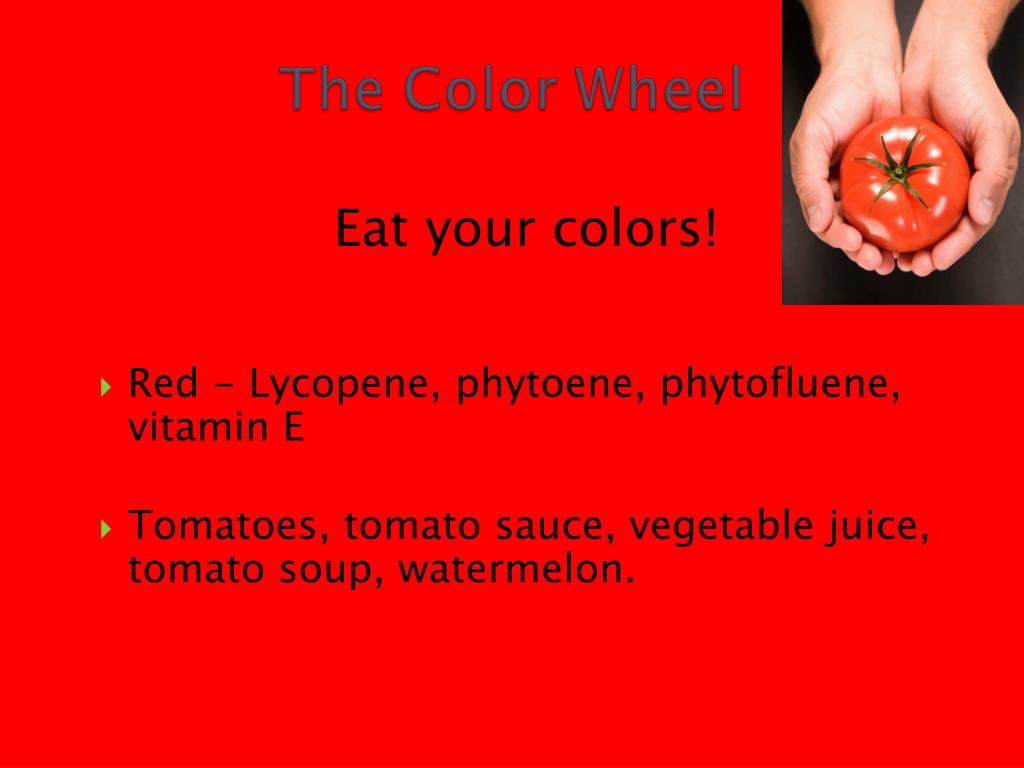 Eat your colors! • Red - Lycopene, phytoene, phytofluene, vitamin E • Tomatoes, tomato sauce, vegetable juice, tomato soup, watermelon.