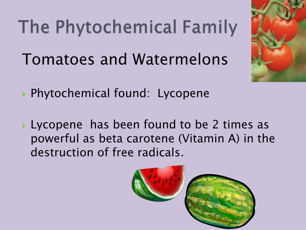 Tomatoes and Watermelons • Phytochemical found: Lycopene • Lycopene has been found to be 2 times as powerful as beta carotene (Vitamin A) in the destruction of free radicals.