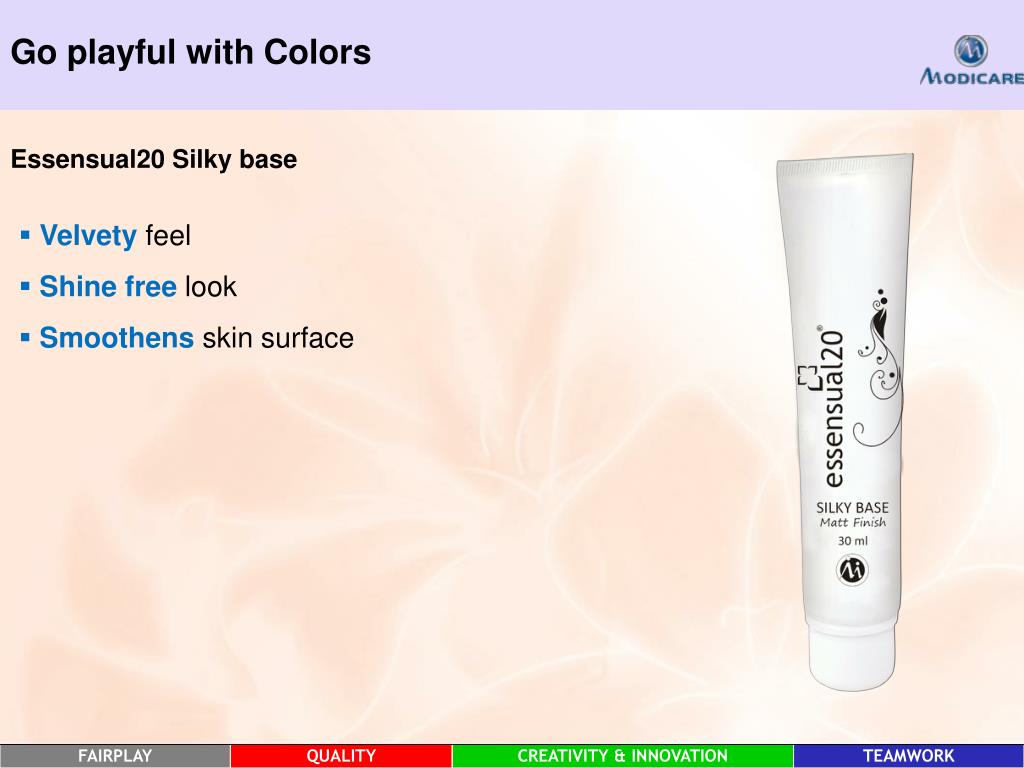Go playful with Colors Essensual20 Silky base • Velvety feel • Shine free look • Smoothensskin surface
