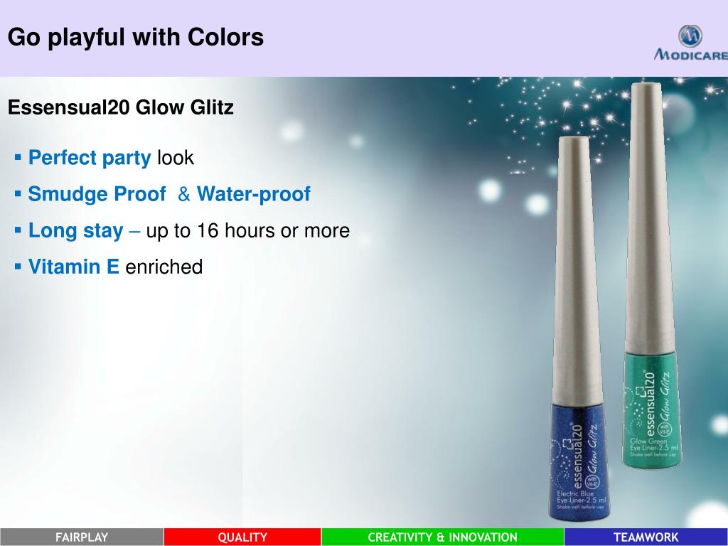 Go playful with Colors Essensual20 Glow Glitz • Perfect party look • Smudge Proof & Water-proof • Long stay – up to 16 hours or more • Vitamin E enriched