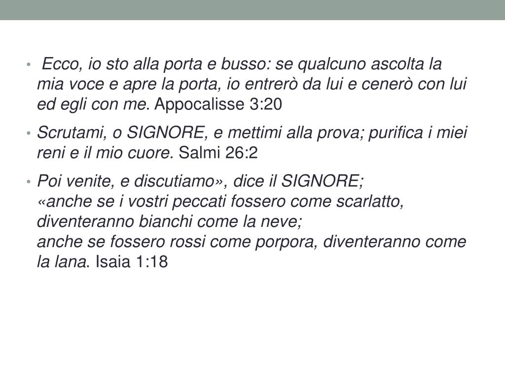 Ecco, io sto alla porta e busso: se qualcuno ascolta la mia voce e apre la porta, io entrerò da lui e cenerò con lui ed egli con me. Appocalisse 3:20 • Scrutami, o SIGNORE, e mettimi alla prova; purifica i miei reni e il mio cuore.Salmi 26:2 • Poi venite, e discutiamo», dice il SIGNORE;«anche se i vostri peccati fossero come scarlatto,diventeranno bianchi come la neve;anche se fossero rossi come porpora, diventeranno come la lana. Isaia 1:18