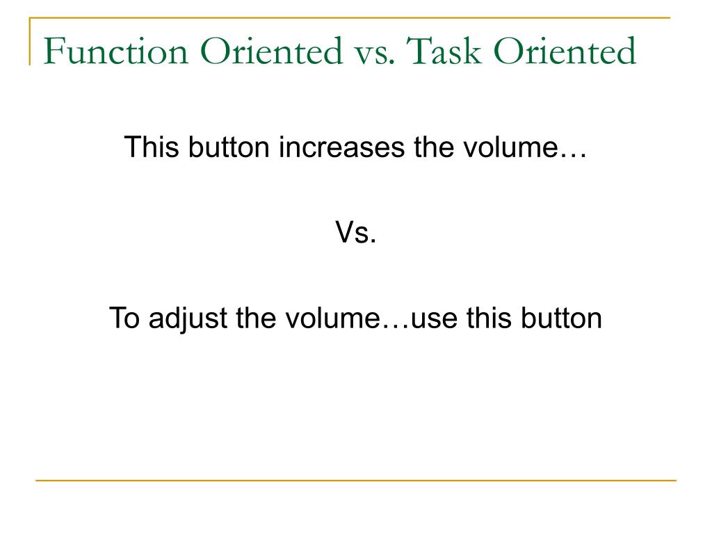 Function Oriented vs. Task Oriented This button increases the volume… Vs. To adjust the volume…use this button