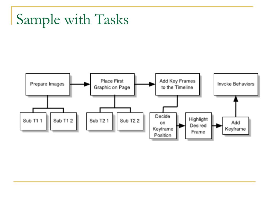 What you want to learn from Task Analysis¹ • Why someone would learn the skill • Prerequisite skills, knowledge, and attitudes • Special materials or tools required • Warnings of dangers, either overall and at specific junctures • The critical steps (no more than 5 -7) and their sequence • All other steps necessary to complete the task and their sequence ¹ Keller, A. “Task Analysis”. Professional Writing 408. 17 Feb 2003. 9 September 2003.<http://web.uvic.ca/akeller/pw408/r_taskanal.html>