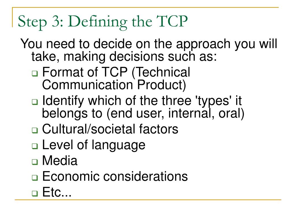 Step 3: Defining the TCP You need to decide on the approach you will take, making decisions such as: • Format of TCP (Technical Communication Product) • Identify which of the three 'types' it belongs to (end user, internal, oral) • Cultural/societal factors • Level of language • Media • Economic considerations • Etc...
