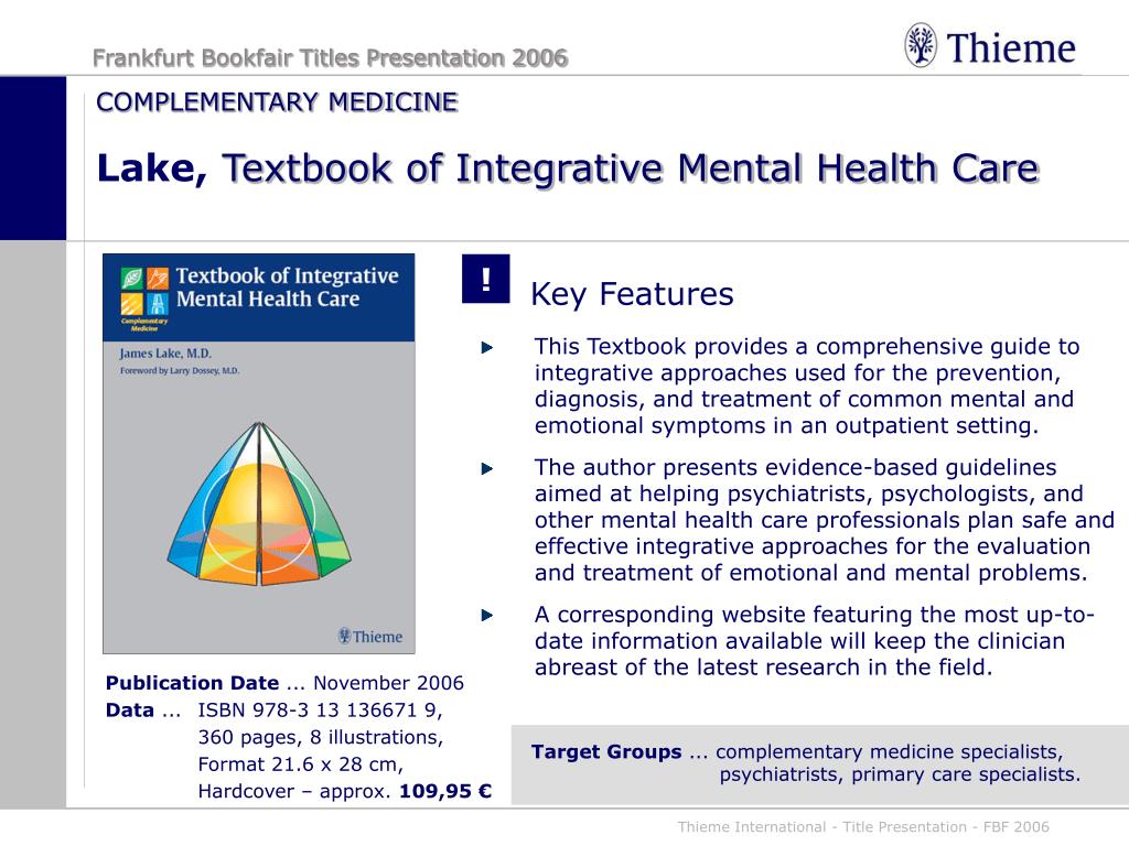 ! Key Features COMPLEMENTARY MEDICINE Lake,Textbook of Integrative Mental Health Care • This Textbook provides a comprehensive guide to integrative approaches used for the prevention, diagnosis, and treatment of common mental and emotional symptoms in an outpatient setting. • The author presents evidence-based guidelines aimed at helping psychiatrists, psychologists, and other mental health care professionals plan safe and effective integrative approaches for the evaluation and treatment of emotional and mental problems. • A corresponding website featuring the most up-to-date information available will keep the clinician abreast of the latest research in the field. Publication Date ... November 2006 Data ... ISBN 978-3 13 136671 9, 360 pages, 8 illustrations, Format 21.6 x 28 cm, Hardcover – approx. 109,95 € Target Groups ... complementary medicine specialists, psychiatrists, primary care specialists.