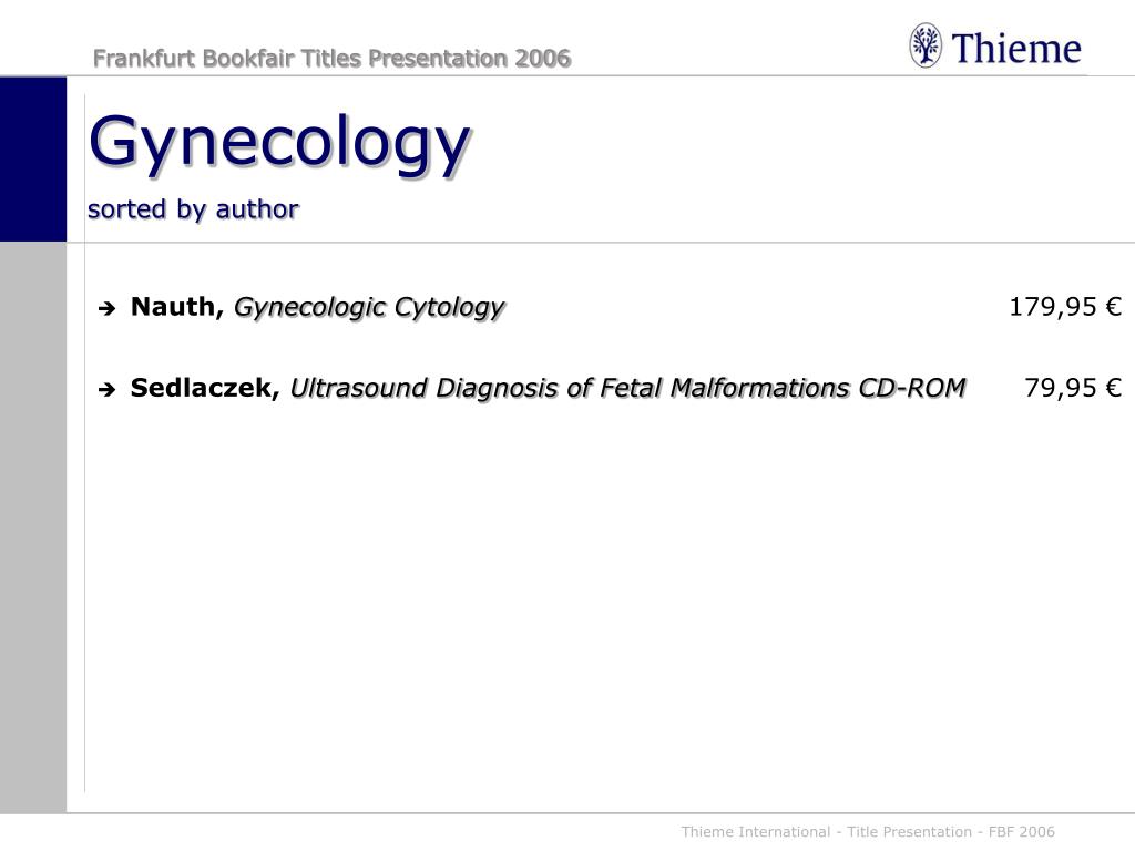 Gynecology sorted by author Nauth, Gynecologic Cytology179,95 € Sedlaczek,Ultrasound Diagnosis of Fetal Malformations CD-ROM79,95 €