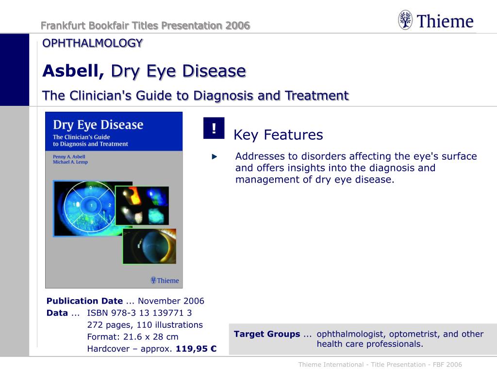 ! Key Features OPHTHALMOLOGY Asbell, Dry Eye Disease The Clinician's Guide to Diagnosis and Treatment • Addresses to disorders affecting the eye's surface and offers insights into the diagnosis and management of dry eye disease. Publication Date ... November 2006 Data ... ISBN 978-3 13 139771 3 272 pages, 110 illustrations Format: 21.6 x 28 cm Hardcover – approx. 119,95 € Target Groups ... ophthalmologist, optometrist, and other health care professionals.