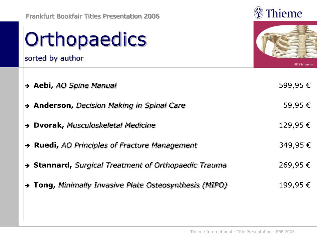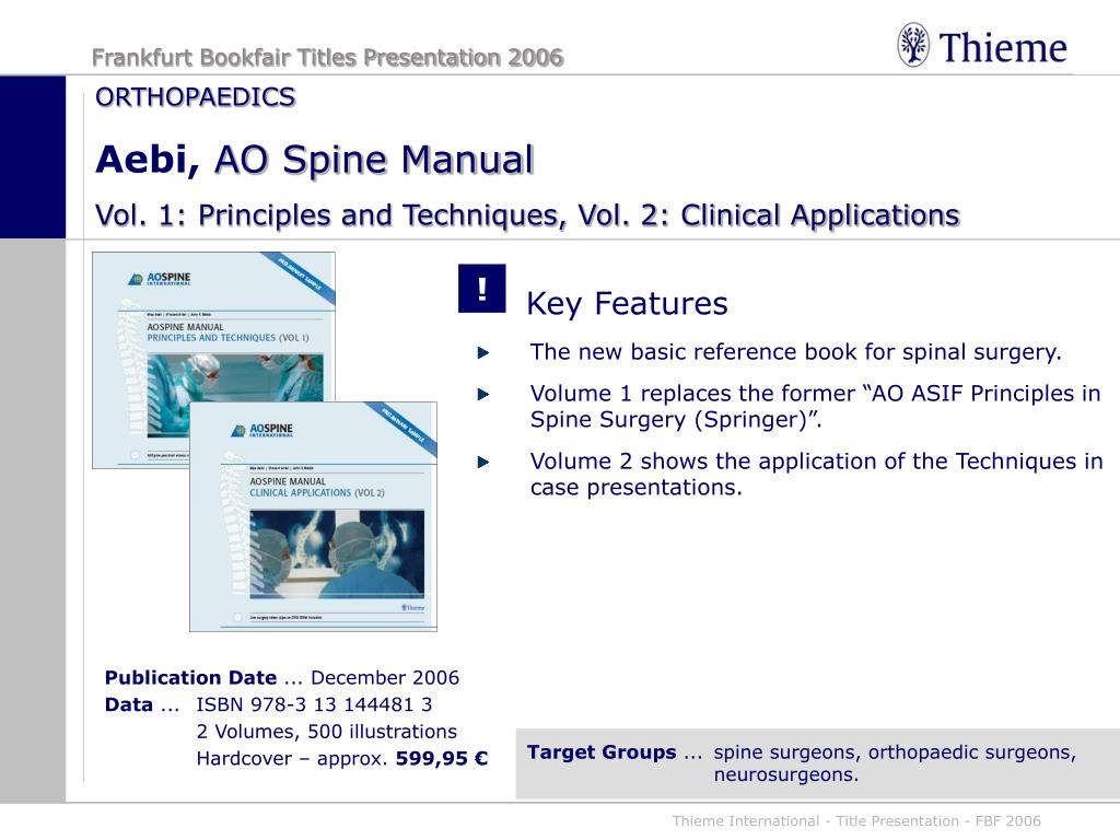 Thieme International. Thieme. Title presentation for new publications September 2006 - March 2007. FBF 2006 new titles list (all prices approx.). Aebi, AO Spine Manual 599,95 €. Anderson, Decision Making in Spinal Care 59,95 €. Asbell, Dry Eye Disease 119,95 €.