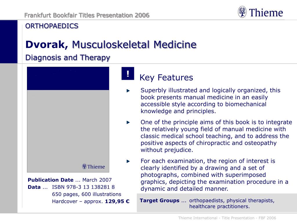 ! Key Features ORTHOPAEDICS Dvorak, Musculoskeletal Medicine Diagnosis and Therapy • Superbly illustrated and logically organized, this book presents manual medicine in an easily accessible style according to biomechanical knowledge and principles. • One of the principle aims of this book is to integrate the relatively young field of manual medicine with classic medical school teaching, and to address the positive aspects of chiropractic and osteopathy without prejudice. • For each examination, the region of interest is clearly identified by a drawing and a set of photographs, combined with superimposed graphics, depicting the examination procedure in a dynamic and detailed manner. Publication Date ... March 2007 Data ... ISBN 978-3 13 138281 8 650 pages, 600 illustrations Hardcover – approx. 129,95 € Target Groups ... orthopaedists, physical therapists, healthcare practitioners.