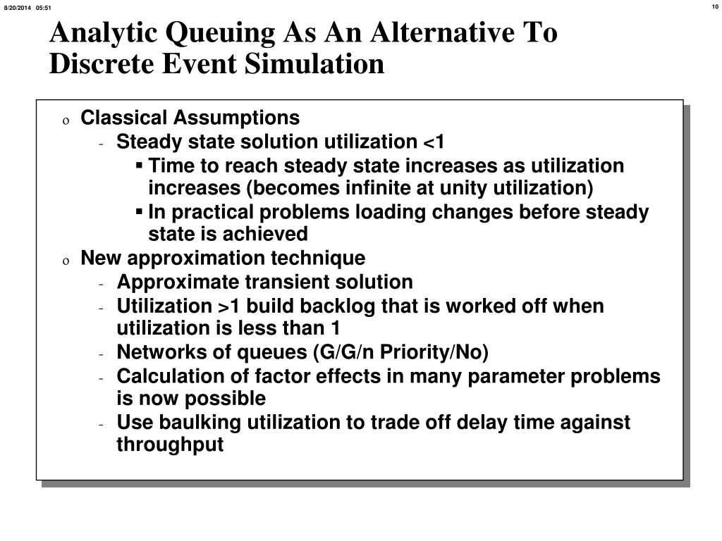 Analytic Queuing As An Alternative To Discrete Event Simulation • Classical Assumptions • Steady state solution utilization <1 • Time to reach steady state increases as utilization increases (becomes infinite at unity utilization) • In practical problems loading changes before steady state is achieved • New approximation technique • Approximate transient solution • Utilization >1 build backlog that is worked off when utilization is less than 1 • Networks of queues (G/G/n Priority/No) • Calculation of factor effects in many parameter problems is now possible • Use baulking utilization to trade off delay time against throughput