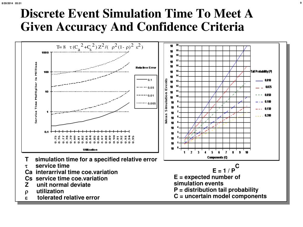 Discrete Event Simulation Time To Meet A Given Accuracy And Confidence Criteria T simulation time for a specified relative error service time Ca interarrival time coe.variation Cs service time coe.variation Z unit normal deviate utilization tolerated relative error C E = 1 / P E = expected number of simulation events P = distribution tail probability C = uncertain model components