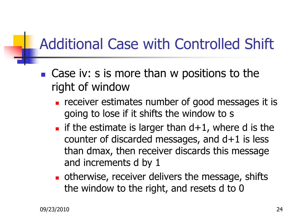 Additional Case with Controlled Shift • Case iv: s is more than w positions to the right of window • receiver estimates number of good messages it is going to lose if it shifts the window to s • if the estimate is larger than d+1, where d is the counter of discarded messages, and d+1 is less than dmax, then receiver discards this message and increments d by 1 • otherwise, receiver delivers the message, shifts the window to the right, and resets d to 0
